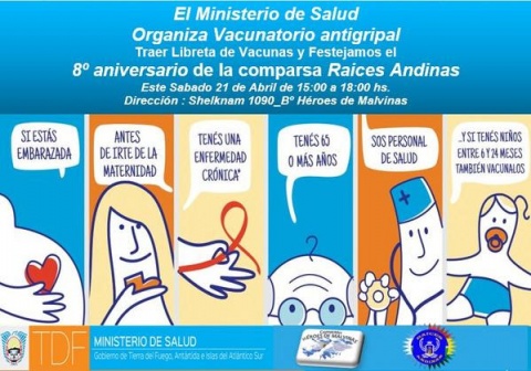 El Ministerio de Salud realizará -este sábado- un "Vacunatorio Antigripal" en la ciudad de Río Grande. La actividad se llevará a cabo de 15 a 18 horas, en calle Shelkman 1090 del Barrio Héroes de Malvinas, en el marco de los festejos por el 8° Aniversario de la comparsa Raíces Andinas.