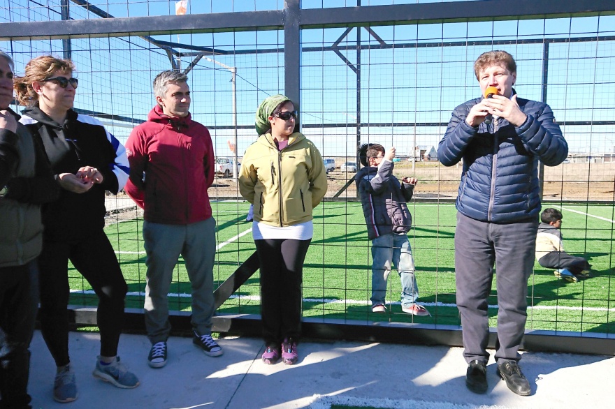 El intendente Gustavo Melella, encabezó este miércoles la inauguración del nuevo playón deportivo y recreativo para los vecinos del barrio Los Cisnes, Vapor Amadeo y aledaños. Estuvo acompañado de los Concejales Verónica González y Paulino Rossi, miembros del gabinete municipal, referentes barriales, vecinos y niños y niñas que comenzaron a disfrutar del flamante espacio.