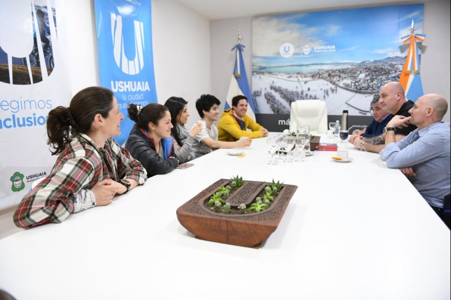 El secretario de Gobierno del Municipio, Omar Becerra, junto al vicepresidente del Instituto Municipal de Deportes, Guillermo Navarro, y el Director de Planificación y Gestión Deportiva, Marcelo Higueras recibieron hoy a los jóvenes atletas Catalina Frungieri y Facundo Rodríguez, quienes estuvieron acompañados por el profesor de esquí de fondo del Club Andino Ushuaia, Martín Bianchi.
