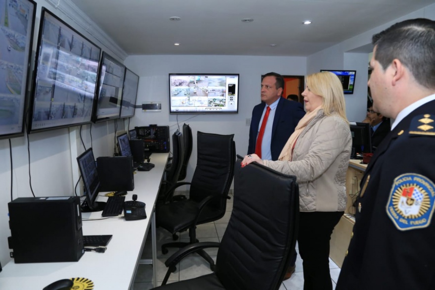 La gobernadora Rosana Bertone, junto con el secretario de Seguridad, Javier Eposto, recorrieron este miércoles las nuevas instalaciones del Centro de Monitoreo y Vigilancia de Río Grande, tras las tareas de refacción y reacondicionamiento. Estos trabajos permiten que actualmente funcionen adecuadamente las 60 cámaras de vigilancia dispuestas en la ciudad.