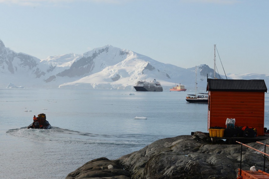 La presencia de un crucero y veleros en la zona confirman que sus montañas nevadas, que sólo dejan al descubierto sus cumbres, y los témpanos circundantes, resultan un gran atractivo turístico; actividad que es regulada para evitar el impacto ambiental.
