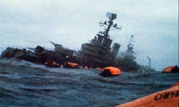 A las 16.01 el primer torpedo MK8 atraviesa la proa del barco, que navega a 30 millas de la zona de exclusión. Perfora las cuatro cubiertas en forma vertical. El agua penetra todos los compartimentos. Solo segundos después, el segundo torpedo se incrusta en la popa.