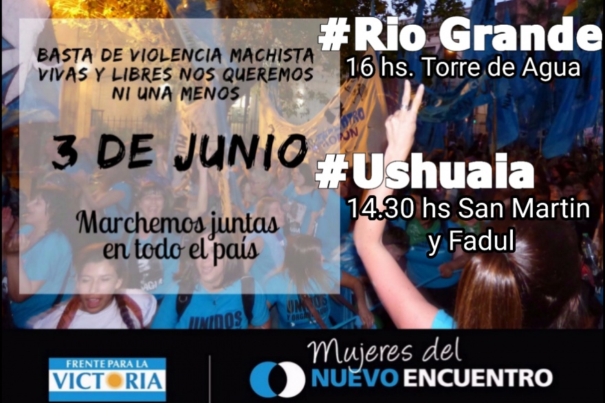 A través de una gacetilla de prensa, el Frente de Mujeres del partido ‘Nuevo Encuentro’ invitó a la comunidad a manifestar su apoyo a la jornada #NiUnaMenos que se realizará mañana, desde las 16 horas, en la Torre de Agua ubicada en la plaza “Almirante Brown” de Río Grande y desde las 14:30 en San Martín y Fadul, en Ushuaia.