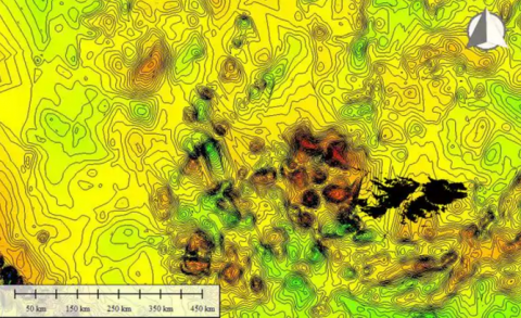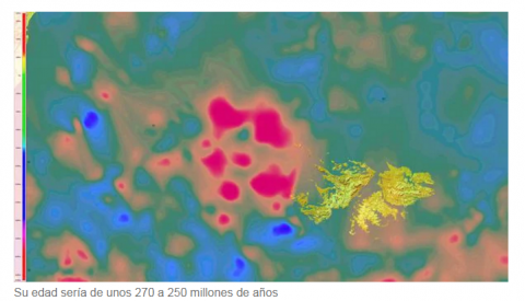 "Una gigantesca 'cuenca' circular de 300 kilómetros de diámetro que está tapada por el agua. Tiene asociadas una anomalía circular gravimétrica negativa, con anillo de valores positivos que la rodea, y una anomalía circular magnética positiva".
