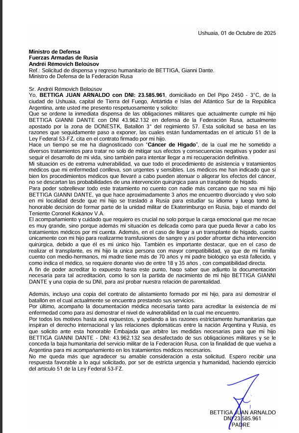En la nota el padre solicita "la inmediata dispensa de obligaciones militares que actualmente cumple mi hijo Bettiga Gianni Dante en defensa de la Federación Rusa actualmente apostado por la zona Donestk, Batallón 3 del Regimiento 57".