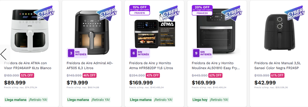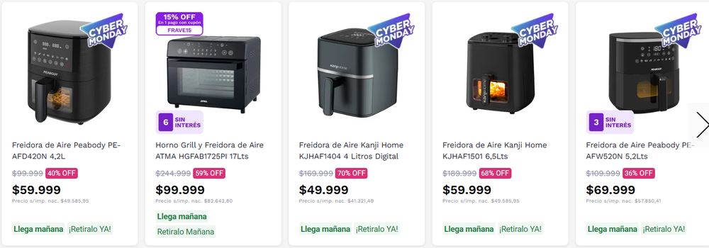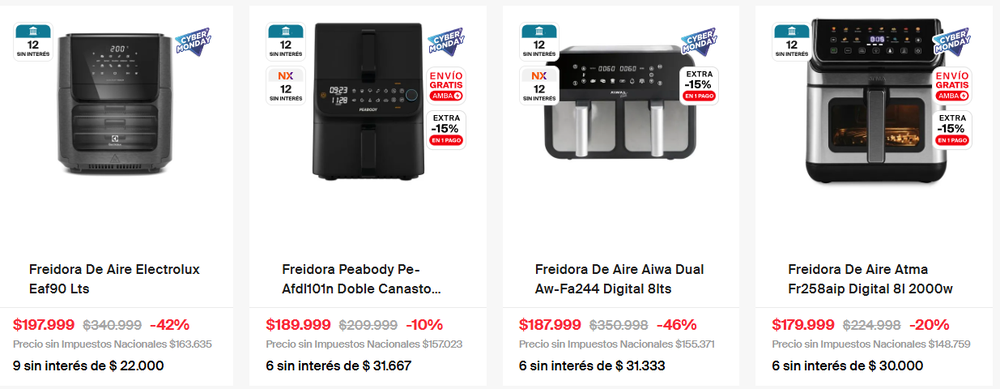 Las principales cadenas de electrodomésticos ofrecen freidoras de aire con descuentos históricos durante el CyberMonday 2025. Según el relevamiento de las promociones actuales en freidoras de aire, los precios parten desde $42.999 y llegan hasta el 70% de descuento, con envíos en 24 hs y hasta 12 cuotas sin interés.