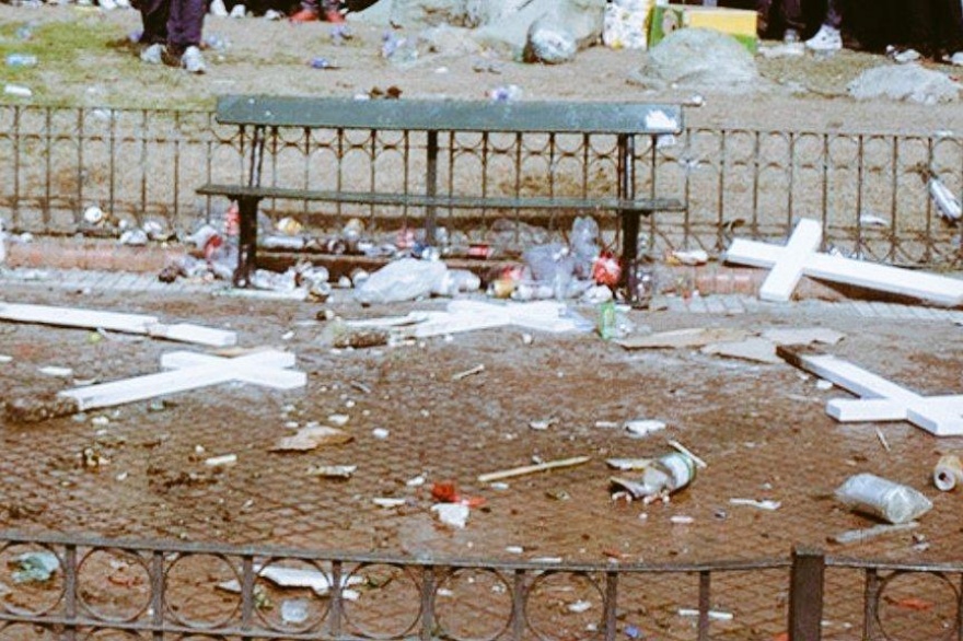 Miembros de Camioneros de Gaseosas se enfrentaron ayer con la facción del gremio de Tierra del Fuego y se tomaron a golpes con palos, botellas y hasta utilizaron cruces que homenajean a ex combatientes de Malvinas en la batalla campal. Los miembros del sindicato profanaron la réplica del Cementerio de Darwin que está montado sobre Plaza de Mayo, donde se erigen 17 cruces para recordad a los soldados de la Fuerza Aérea que cayeron en el enfrentamiento de 1982.