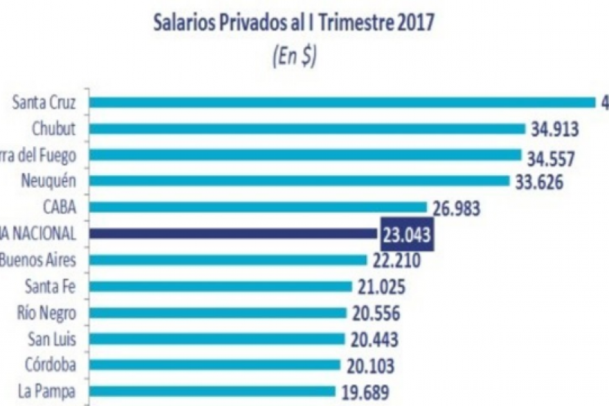 El sueldo promedio que pagan las empresas privadas en la Argentina ronda los $ 23.043 bruto mensual. Pero solo cinco regiones están por encima de ese valor: Santa Cruz, Chubut, Tierra del Fuego, Neuquén y la Ciudad de Buenos Aires, en ese orden. En el resto del país los salarios privados son menores, según un relevamiento de la consultora Economía & Regiones, en base a datos del Ministerio de Trabajo correspondientes al primer trimestre del año.